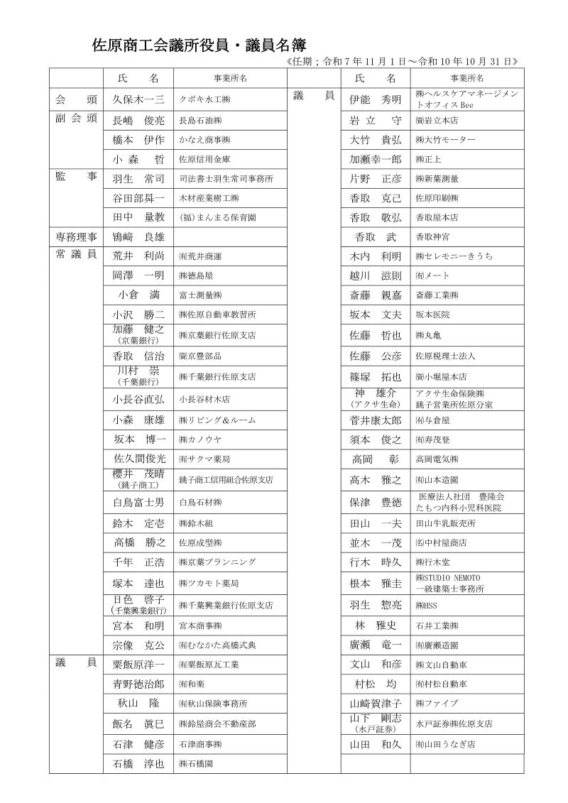 佐原商工会議所会・議員名簿(令和7年11月1日~令和10年10月31日/PDFデータ164KB)